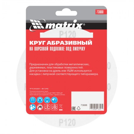 Круг абразивный на ворсовой подложке под "липучку", P 120, 150 мм, 5 шт Matrix (73888)