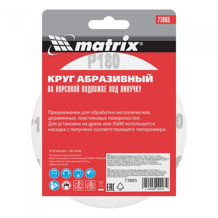 Круг абразивный на ворсовой подложке под "липучку", P 180, 125 мм, 10 шт Matrix (73865)
