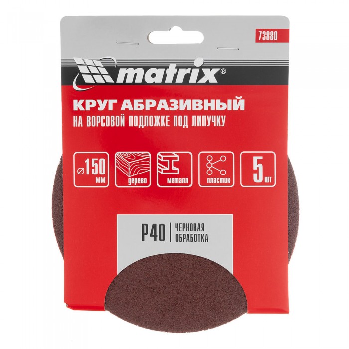 Круг абразивный на ворсовой подложке под "липучку", P 40, 150 мм, 5 шт Matrix (73880)