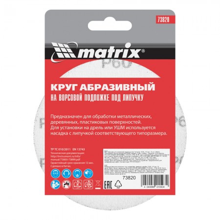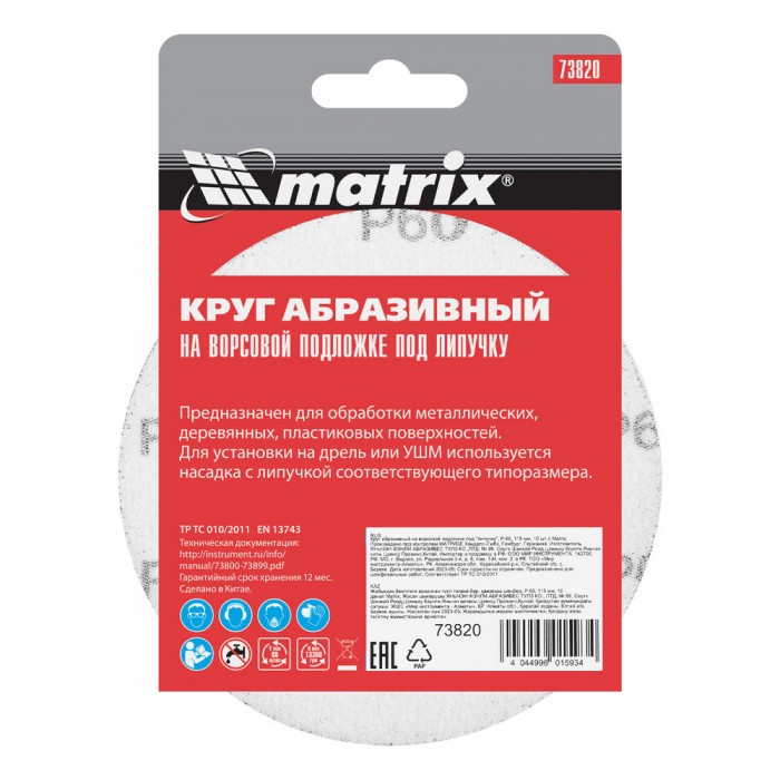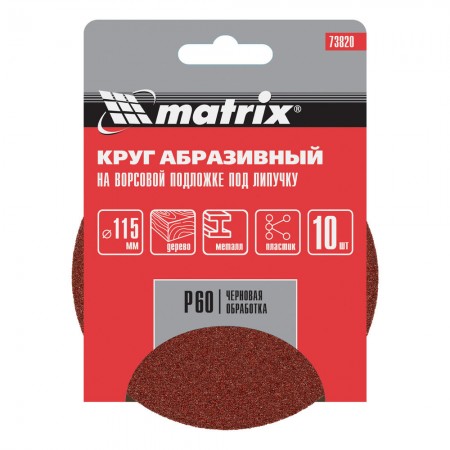 Круг абразивный на ворсовой подложке под "липучку", P 60, 115 мм, 10 шт Matrix (73820)