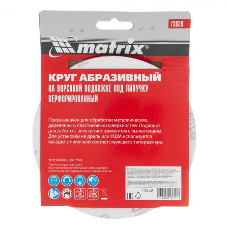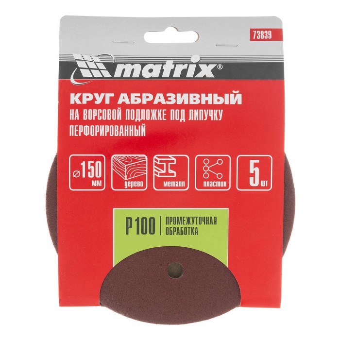Круг абразивный на ворсовой подложке под "липучку", перфорированный, P 100, 150 мм, 5 шт Matrix (73839)
