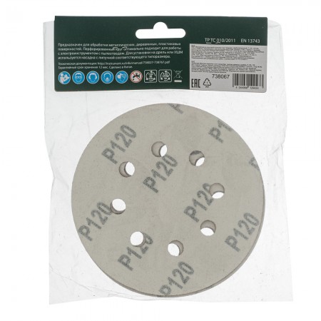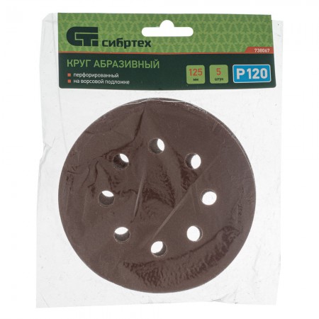 Круг абразивный на ворсовой подложке под "липучку", перфорированный, P 120, 125 мм, 5 шт Сибртех (738067)