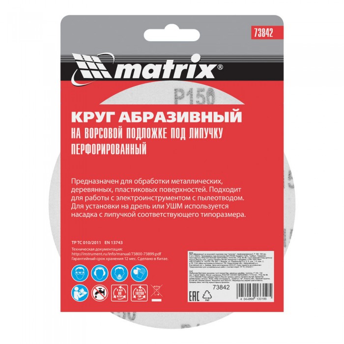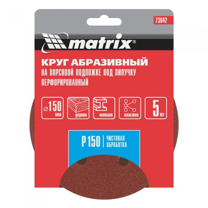 Круг абразивный на ворсовой подложке под "липучку", перфорированный, P 150, 150 мм, 5 шт Matrix (73842)