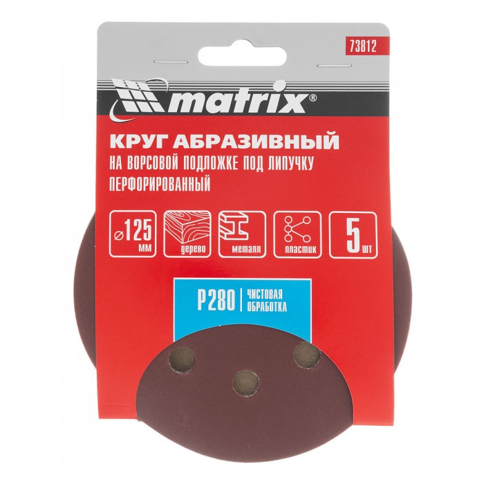 Круг абразивный на ворсовой подложке под "липучку", перфорированный, P 280, 125 мм, 5 шт Matrix (73812)