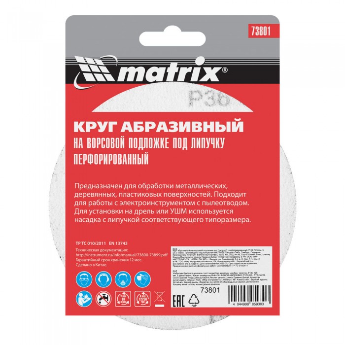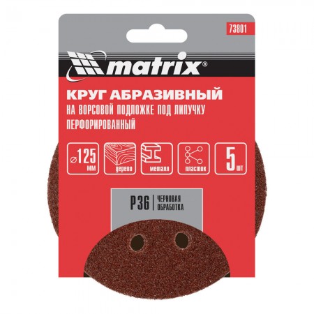 Круг абразивный на ворсовой подложке под "липучку", перфорированный, P 36, 125 мм, 5 шт Matrix (73801)