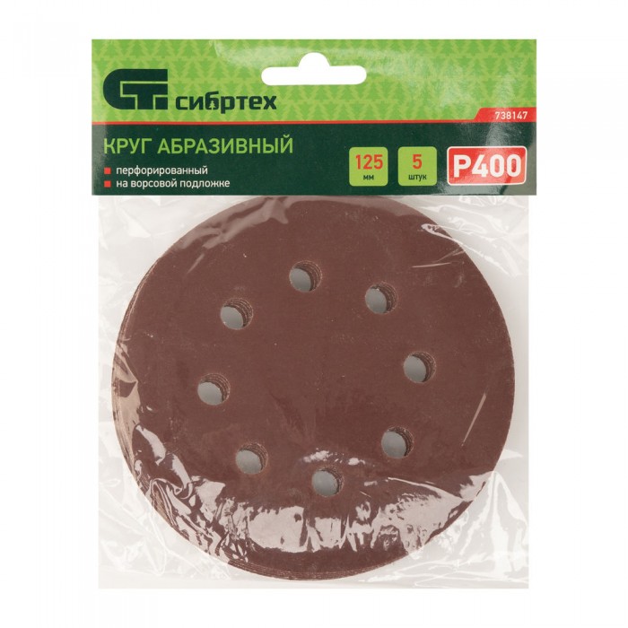 Круг абразивный на ворсовой подложке под "липучку", перфорированный, P 400, 125 мм, 5 шт Сибртех (738147)