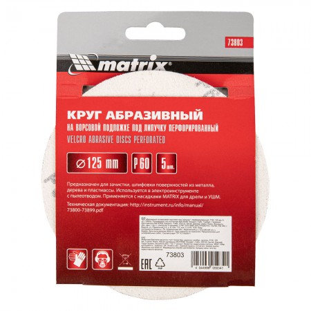 Круг абразивный на ворсовой подложке под "липучку", перфорированный, P 60, 125 мм, 5 шт Matrix (73803)