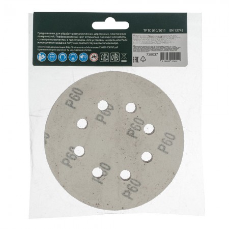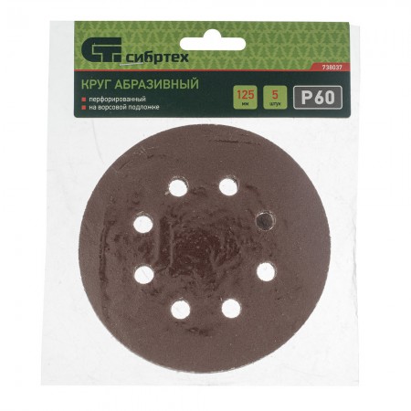 Круг абразивный на ворсовой подложке под "липучку", перфорированный, P 60, 125 мм, 5 шт Сибртех (738037)