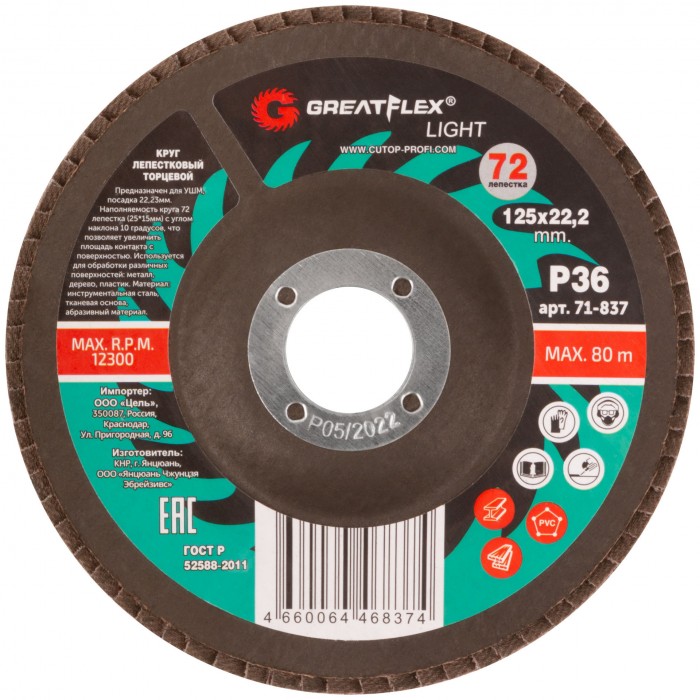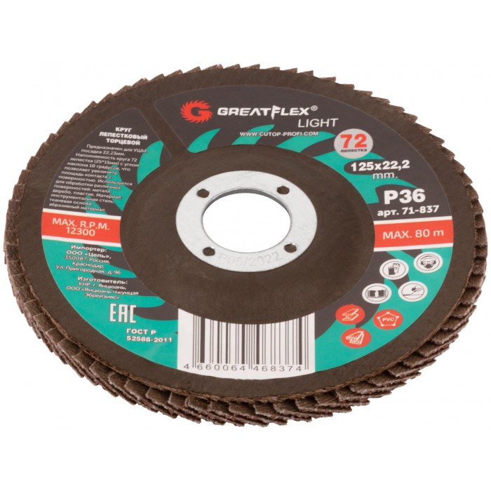Круг лепестковый торцевой GreatFlex Light (72 лепестка) 125 х 22,2 мм, P36 (71-837)