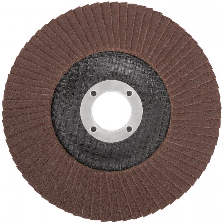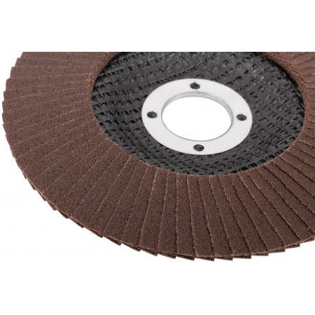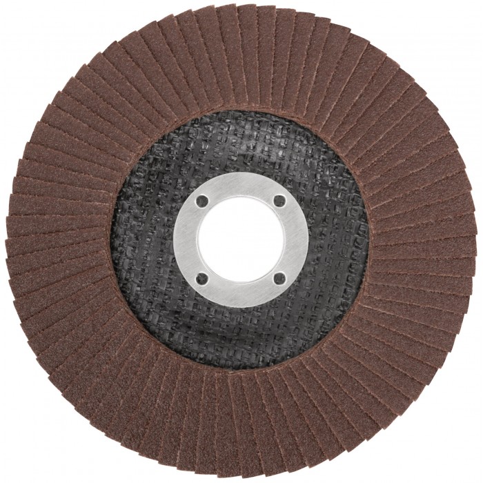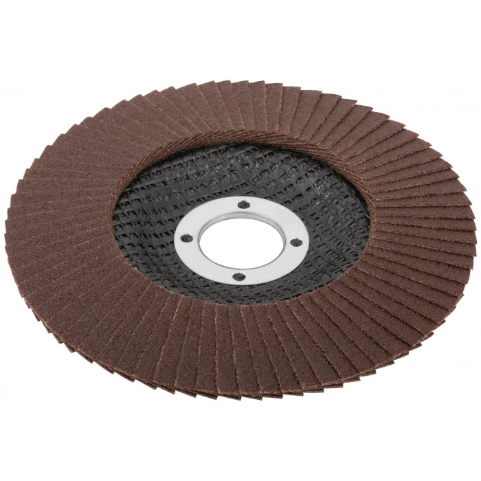 Предназначен для УШМ, посадка 22,23 мм. Наполняемость круга 72 лепестка (28x17мм) с углом наклона 10 градусов, что позволяет увеличить площадь контакта с поверхностью. Используется для обработки различных поверхностей: металл, дерево, пластик. Материал: инструментальная сталь, тканевая основа, абразивный материал.