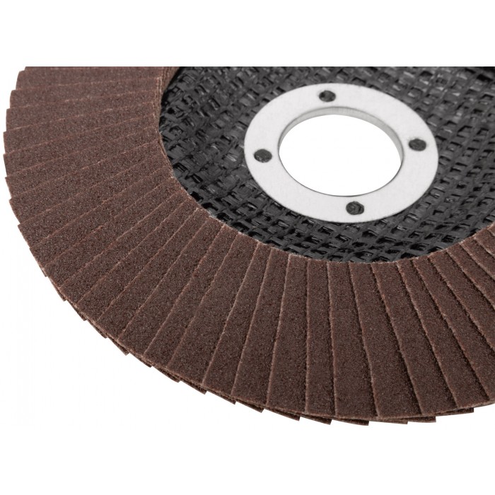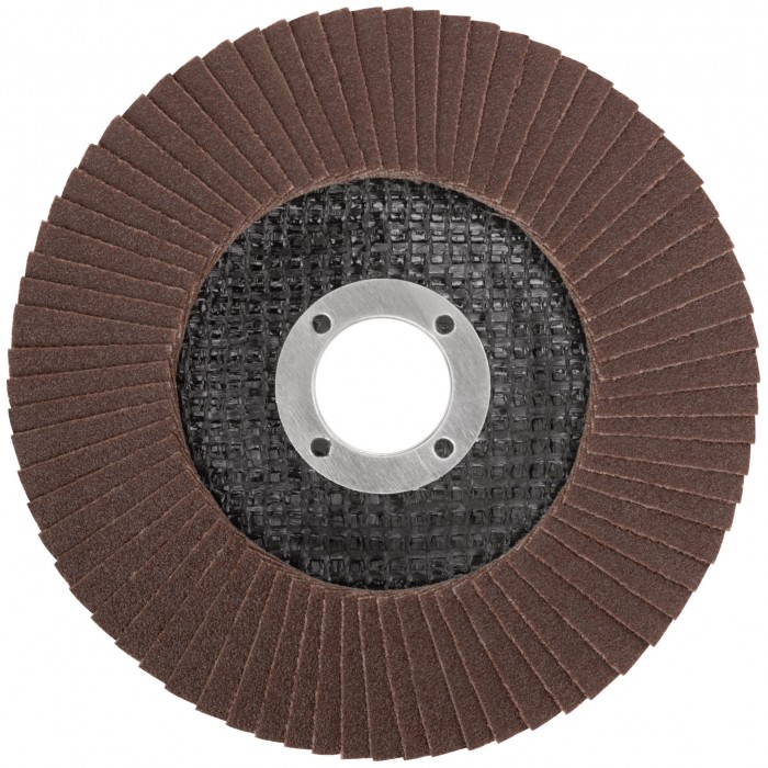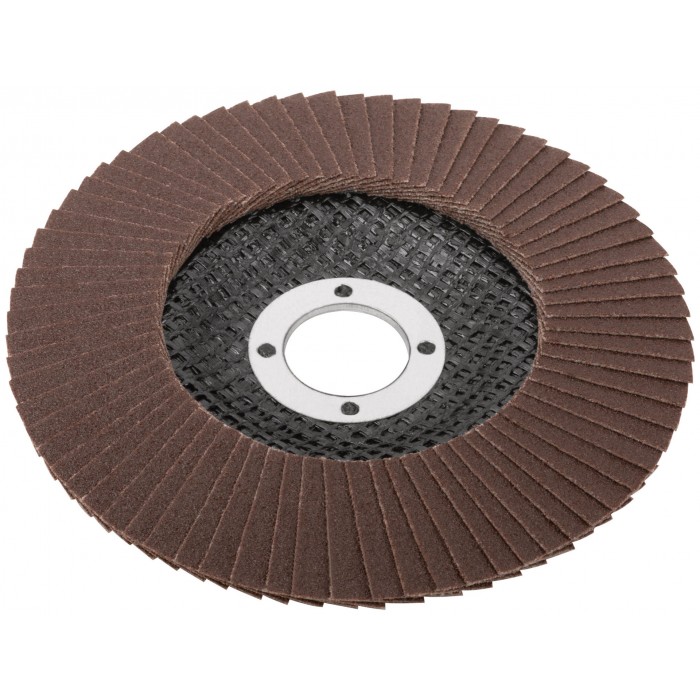 Предназначен для УШМ, посадка 22,23 мм. Наполняемость круга 72 лепестка (28x17мм) с углом наклона 10 градусов, что позволяет увеличить площадь контакта с поверхностью. Используется для обработки различных поверхностей: металл, дерево, пластик. Материал: инструментальная сталь, тканевая основа, абразивный материал.