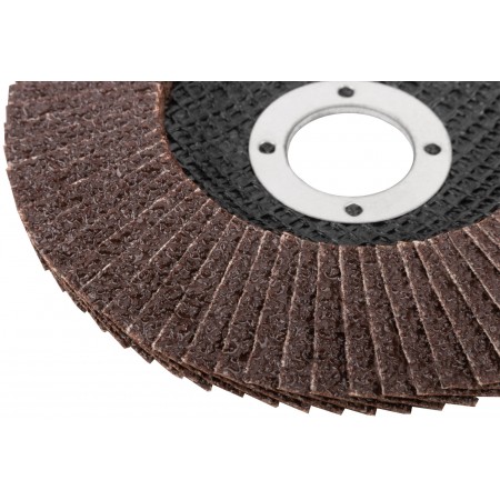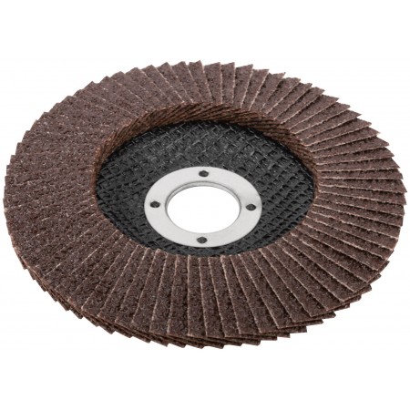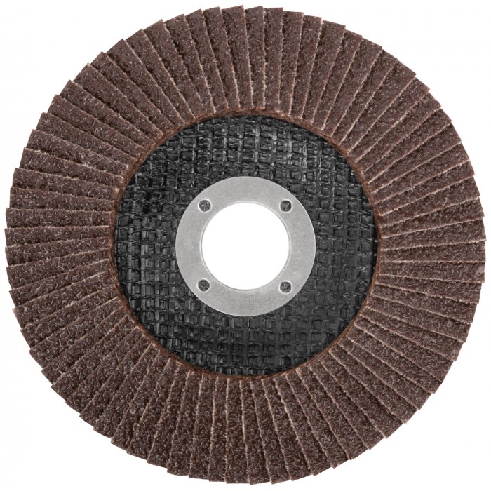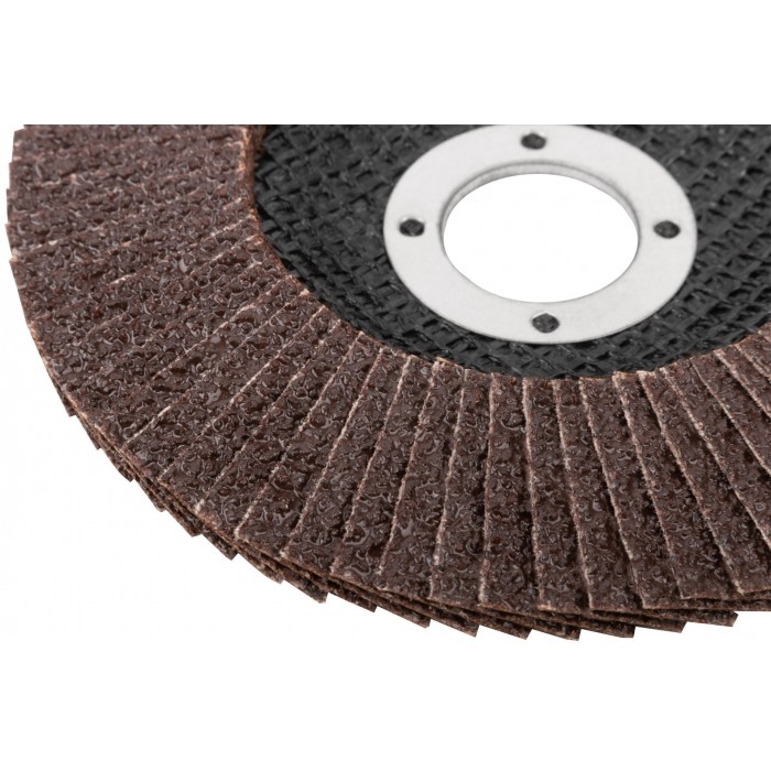 Предназначен для УШМ, посадка 22,23 мм. Наполняемость круга 72 лепестка (28x17мм) с углом наклона 10 градусов, что позволяет увеличить площадь контакта с поверхностью. Используется для обработки различных поверхностей: металл, дерево, пластик. Материал: инструментальная сталь, тканевая основа, абразивный материал.