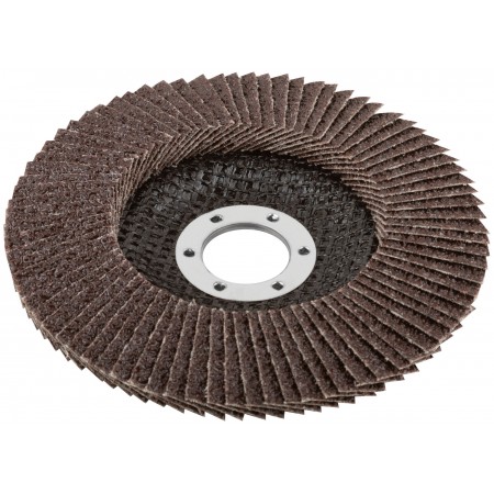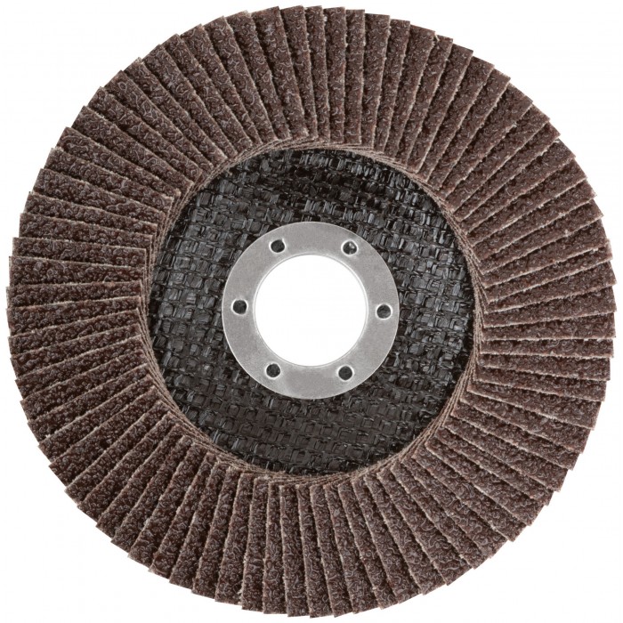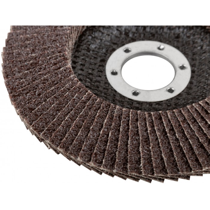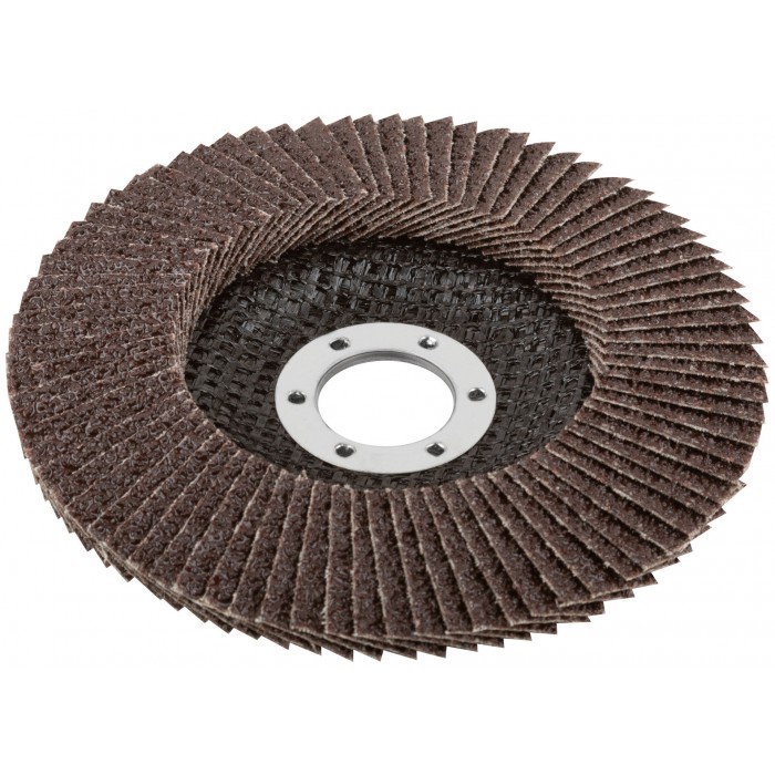 Тип 2 (Конический). 80 лепестков. Для УШМ. Посадочный диаметр 22,2 мм. Абразивный слой из кальцинированного оксида алюминия увеличивает скорость обработки поверхности. Для сухого шлифования и снятия краски с нержавеющей стали, инструментальной стали, чугуна, цветных металлов, пластика и дерева. Материал: абразивный слой - кальцинированный оксид алюминия, основа - х/б ткань, подложка - стекловолокно, обод - инструментальная сталь.