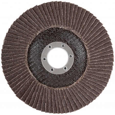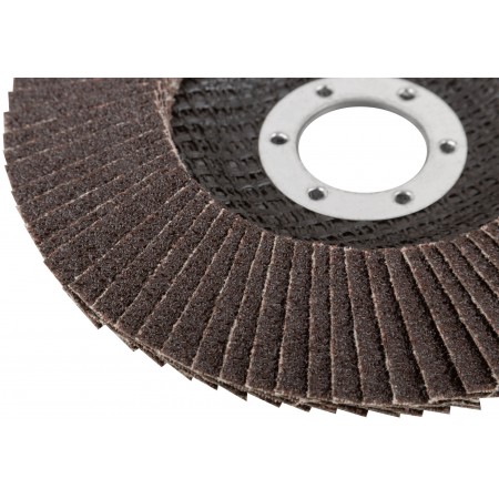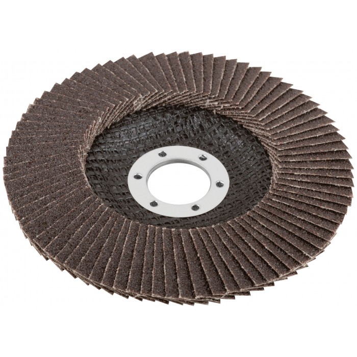 Тип 2 (Конический). 80 лепестков. Для УШМ. Посадочный диаметр 22,2 мм. Абразивный слой из кальцинированного оксида алюминия увеличивает скорость обработки поверхности. Для сухого шлифования и снятия краски с нержавеющей стали, инструментальной стали, чугуна, цветных металлов, пластика и дерева. Материал: абразивный слой - кальцинированный оксид алюминия, основа - х/б ткань, подложка - стекловолокно, обод - инструментальная сталь.