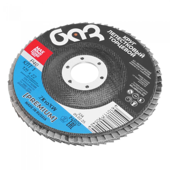 Круг лепестковый торцевой КЛТ-1, ZK10X W (цирконий) зернистость 40Н(Р 40) 125 х 22.2 мм, "БАЗ" (74020)