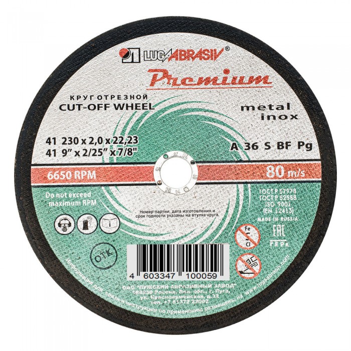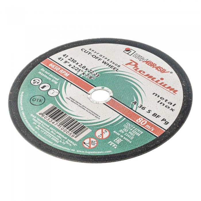 Круг отрезной по металлу и нержавеющей стали, 230 х 2.0 х 22 мм, Премиум "Луга" (73743)