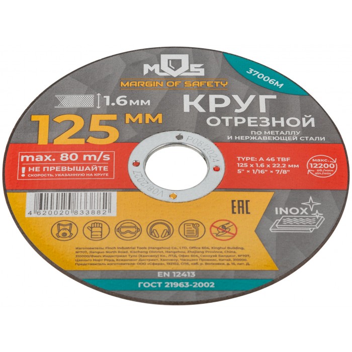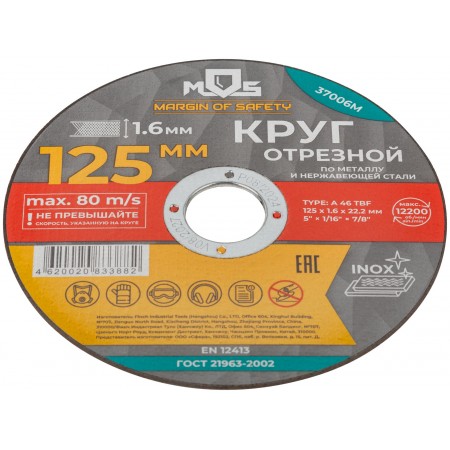 Круг отрезной по металлу MOS, посадочный диаметр 22,2 мм, 125х1,6 мм (37006М)