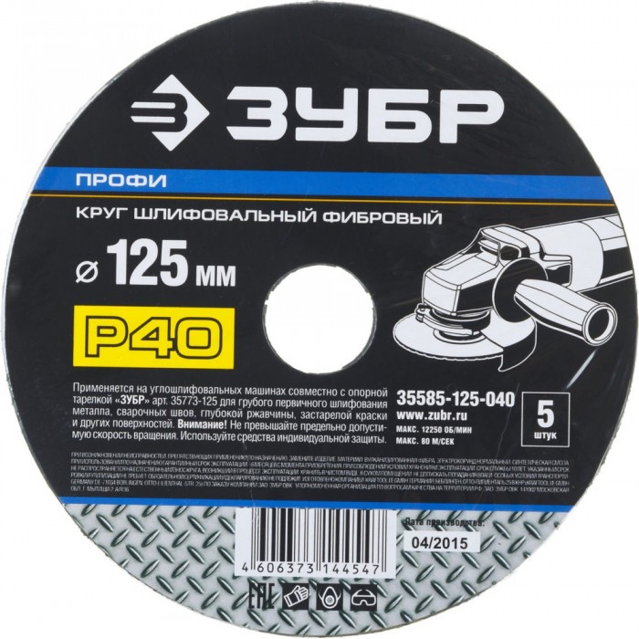 Круг шлифовальный фибровый Профи 125 x 22 мм, P40, для УШМ, 5 листов ЗУБР 35585-125-040