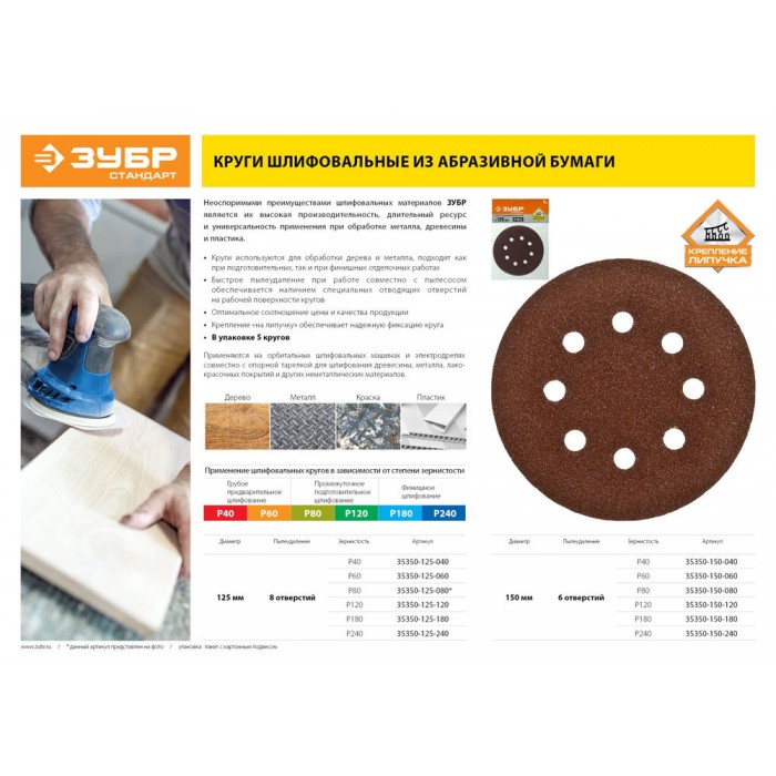 Неоспоримыми преимуществами шлифовальных материалов ЗУБР является их высокая производительность, длительный ресурс и универсальность применения при обработке металла, древесины и пластика.
