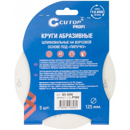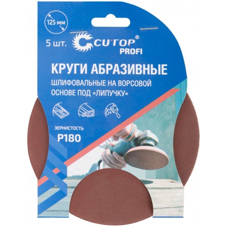 Круги абразивные шлифовальные на ворсовой основе под "липучку" ( Р180, 125 мм, 5шт.), Cutop Profi (85-608)