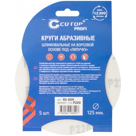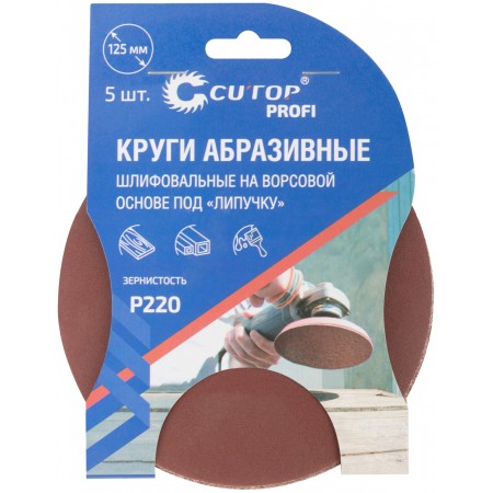 Круги абразивные шлифовальные на ворсовой основе под "липучку" ( Р220, 125 мм, 5шт.), Cutop Profi (85-609)