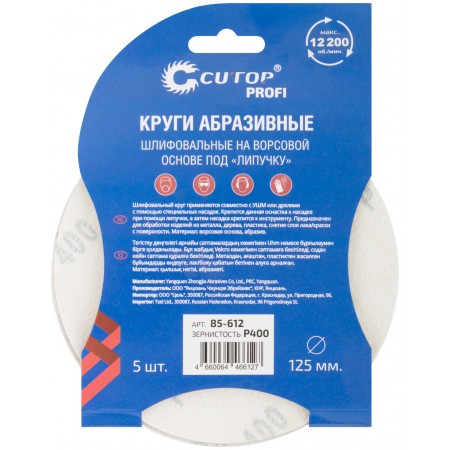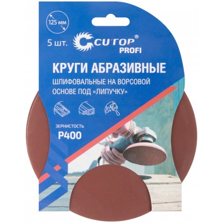 Круги абразивные шлифовальные на ворсовой основе под "липучку" ( Р400, 125 мм, 5шт.), Cutop Profi (85-612)