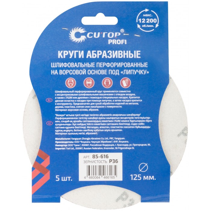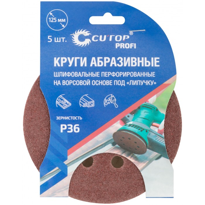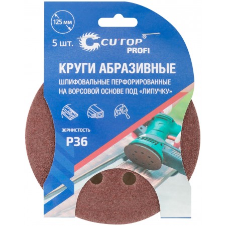 Круги абразивные шлифовальные перфорированные на ворсовой основе под "липучку" (Р36, 125 мм, 5шт.), CUTOP Profi (85-616)