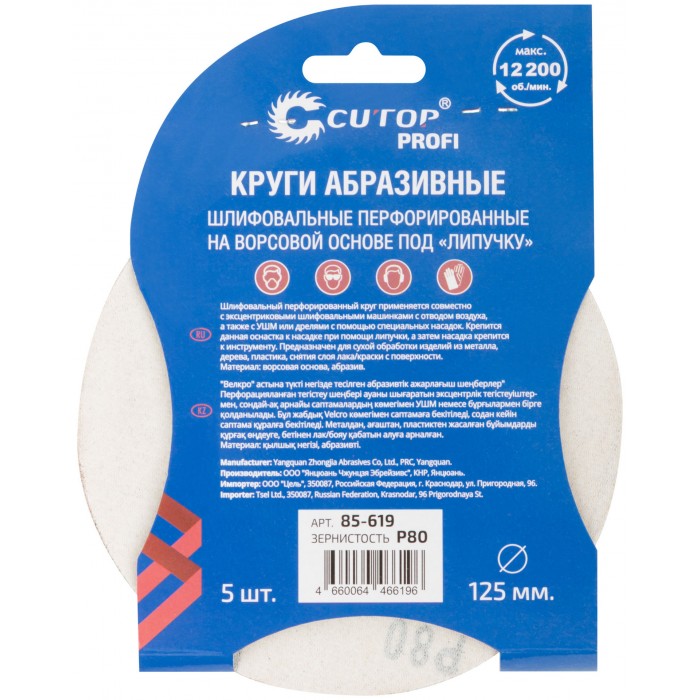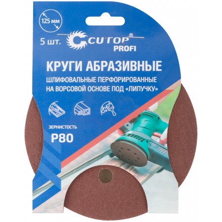 Круги абразивные шлифовальные перфорированные на ворсовой основе под "липучку" (Р80, 125 мм, 5шт.), CUTOP Profi (85-619)
