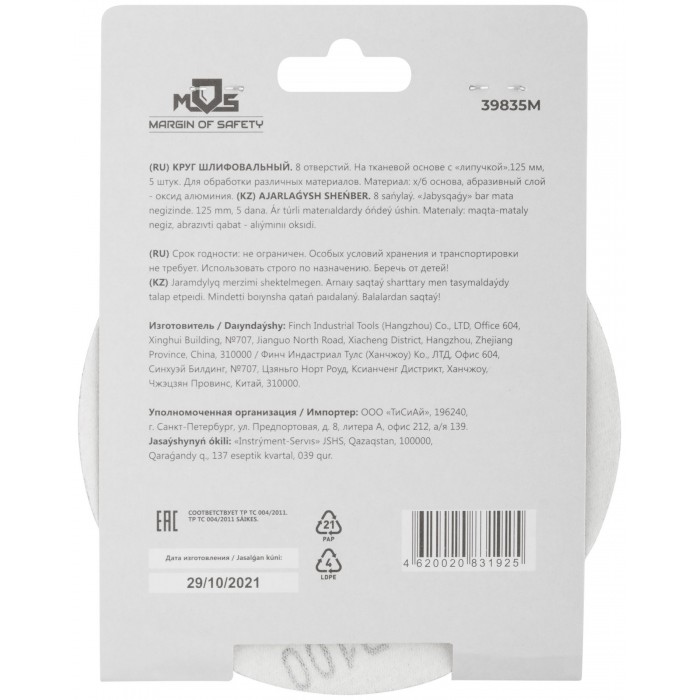 Круги шлифовальные с отверстиями (липучка), алюминий-оксидные, 125 мм, 5 шт. Р 100 (39835М)