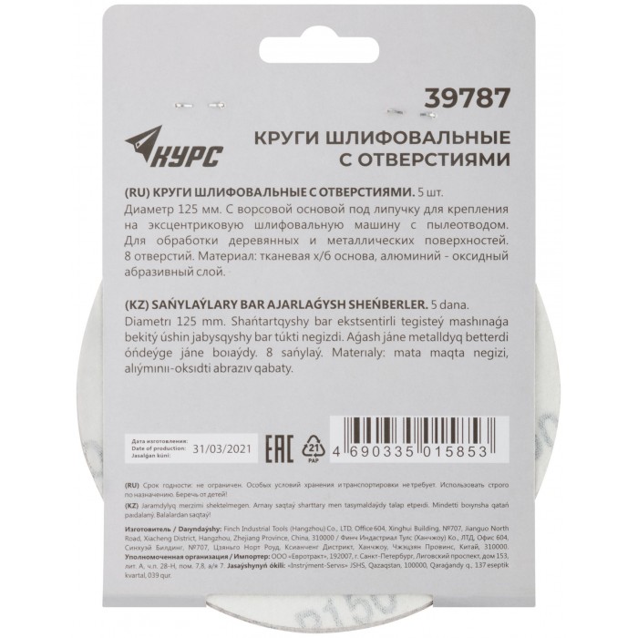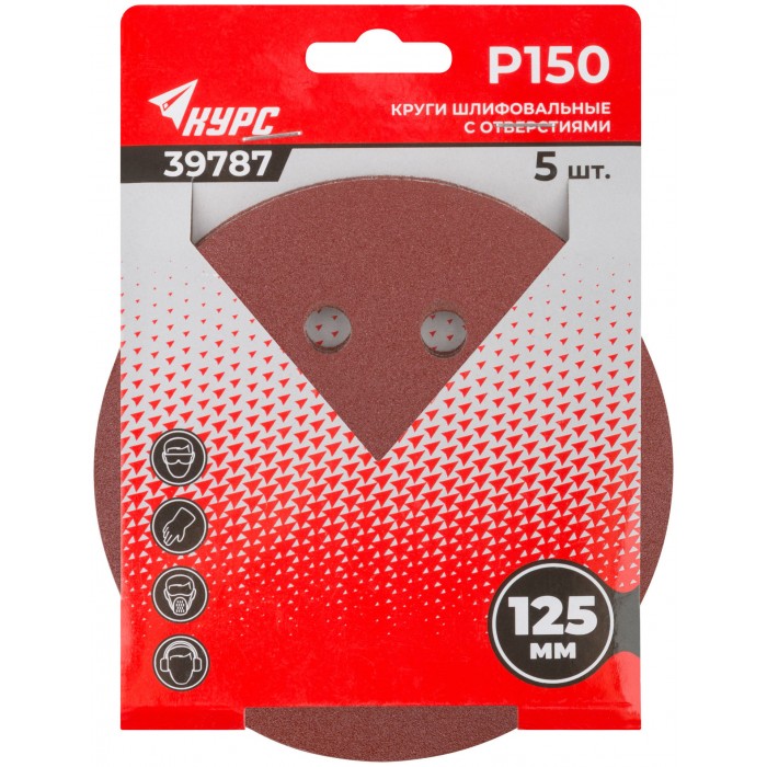 Круги шлифовальные с отверстиями (липучка), алюминий-оксидные, 125 мм, 5 шт. Р 150 (39787)
