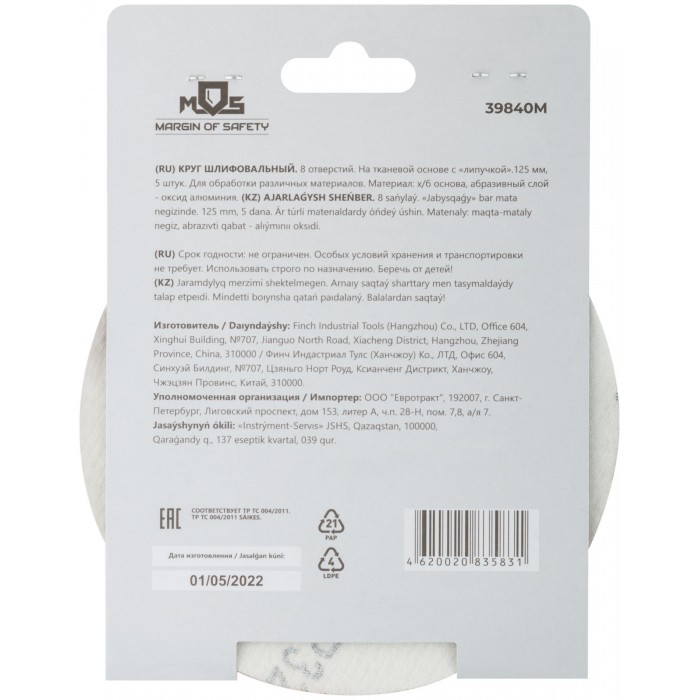 Круги шлифовальные с отверстиями (липучка), алюминий-оксидные, 125 мм, 5 шт. Р 320 (39840М)