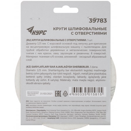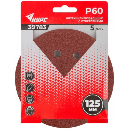 Круги шлифовальные с отверстиями (липучка), алюминий-оксидные, 125 мм, 5 шт. Р 60 (39783)