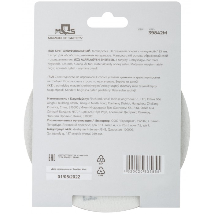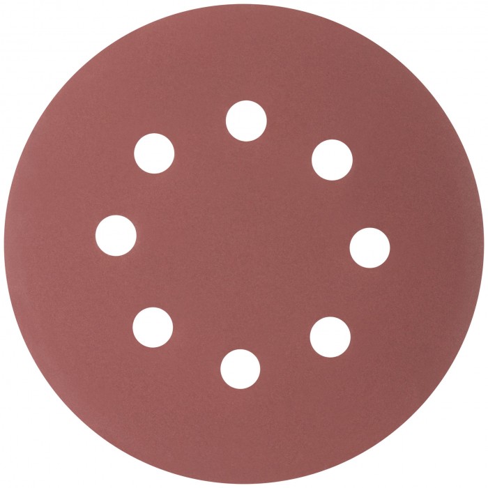 8 отверстий. На тканевой основе с «липучкой». Диаметр 125 мм, набор 5 шт. Для обработки различных материалов. Материал: х/б основа, абразивный слой - оксид алюминия.