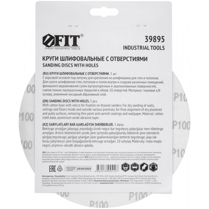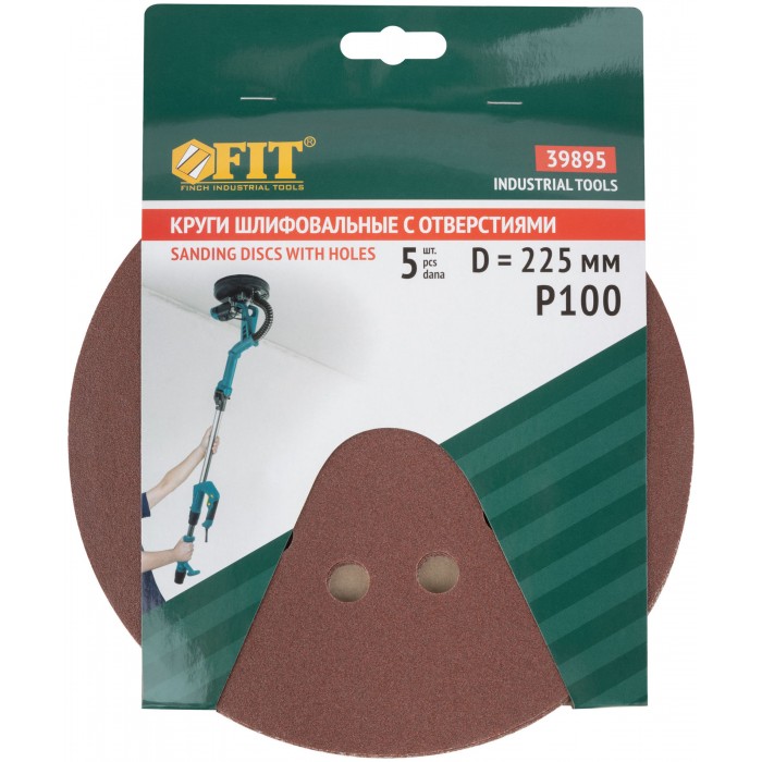 Круги шлифовальные с отверстиями (липучка), алюминий-оксидные, 225 мм, 5 шт. Р 100 (39895)