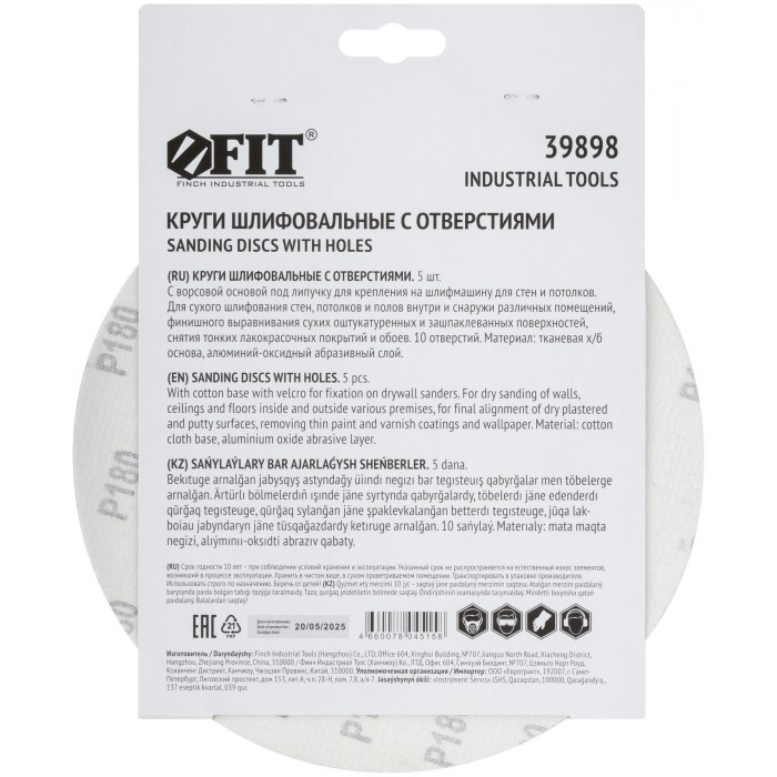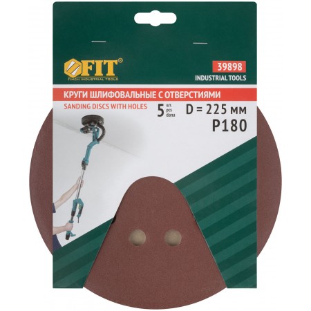 Круги шлифовальные с отверстиями (липучка), алюминий-оксидные, 225 мм, 5 шт. Р 180 (39898)
