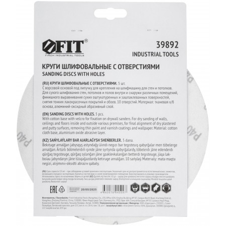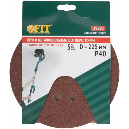 Круги шлифовальные с отверстиями (липучка), алюминий-оксидные, 225 мм, 5 шт. Р 40 (39892)