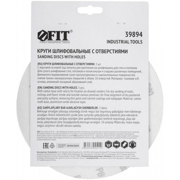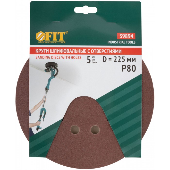 Круги шлифовальные с отверстиями (липучка), алюминий-оксидные, 225 мм, 5 шт. Р 80 (39894)