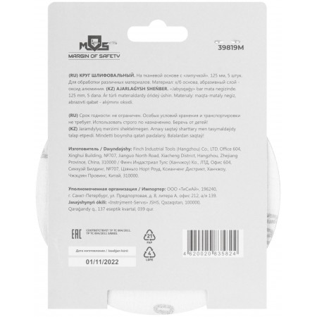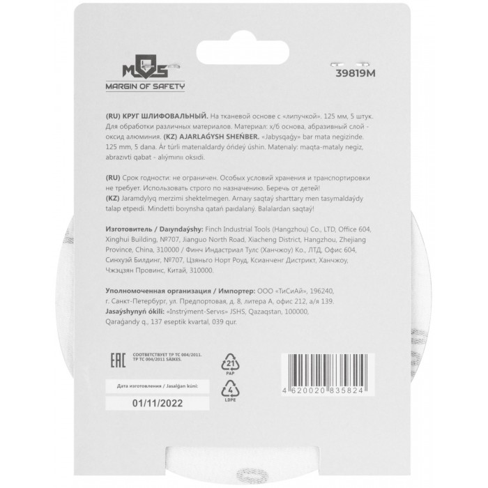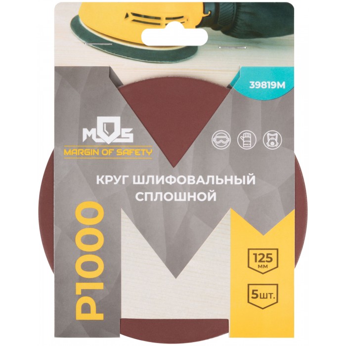Круги шлифовальные сплошные (липучка), алюминий-оксидные, 125 мм, 5 шт. Р 1000 (39819М)