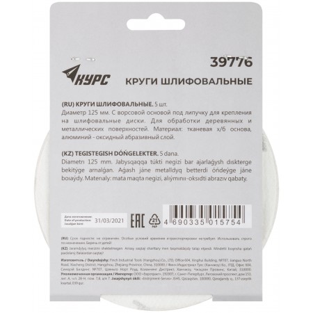 D=125 мм. Цена за набор 5 шт. На тканевой основе с липучкой. Для обработки плоских поверхностей. Материал: абразивный слой из оксида алюминия. Упаковка: картонный конверт.