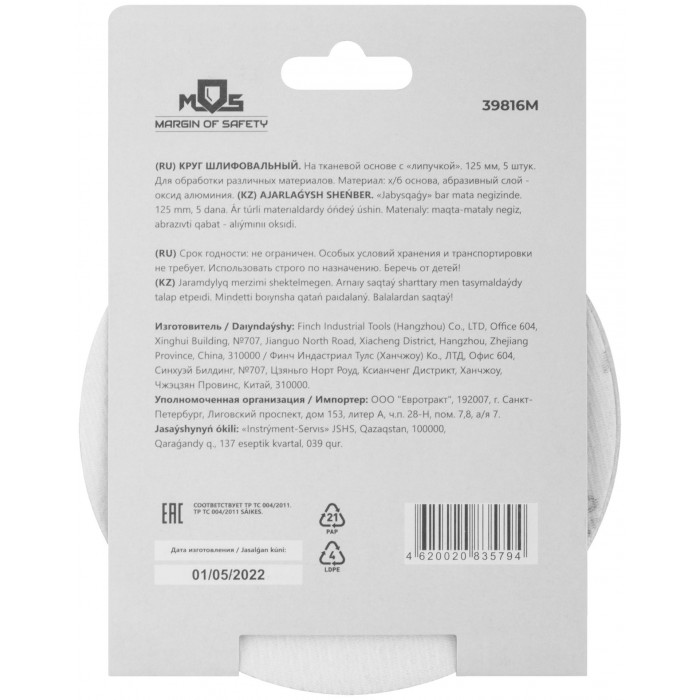На тканевой основе с ''липучкой''. Диаметр 125 мм, набор 5 шт. Для обработки различных метериалов. Материал: х/б основа, образивный слой-оксид алюминия.