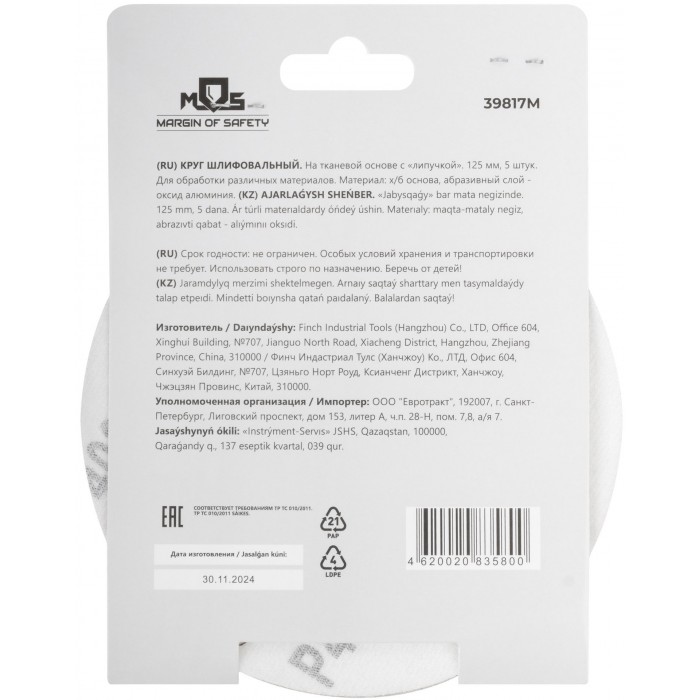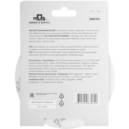 На тканевой основе с ''липучкой''. Диаметр 125 мм, набор 5 шт. Для обработки различных метериалов. Материал: х/б основа, образивный слой-оксид алюминия.