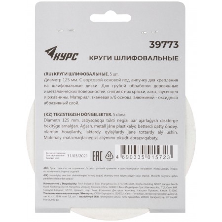 D=125 мм. Цена за набор 5 шт. На тканевой основе с липучкой. Для обработки плоских поверхностей. Материал: абразивный слой из оксида алюминия. Упаковка: картонный конверт.