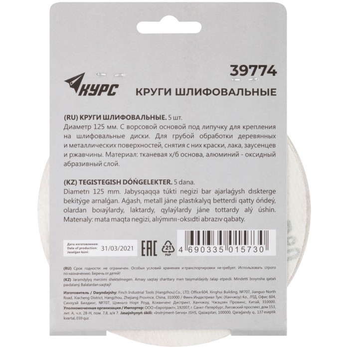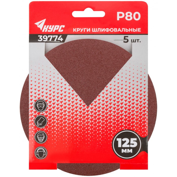 Круги шлифовальные сплошные (липучка), алюминий-оксидные, 125 мм, 5 шт. Р 80 (39774)
