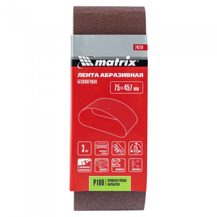 Лента абразивная бесконечная, P 100, 75 х 457 мм, 3 шт Matrix (74278)