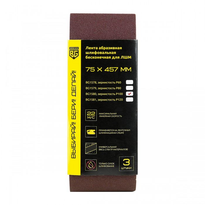 Лента абразивная шлифовальная бесконечная для ЛШМ (3 шт, 75х457 мм, P100) BERGER BG1580
