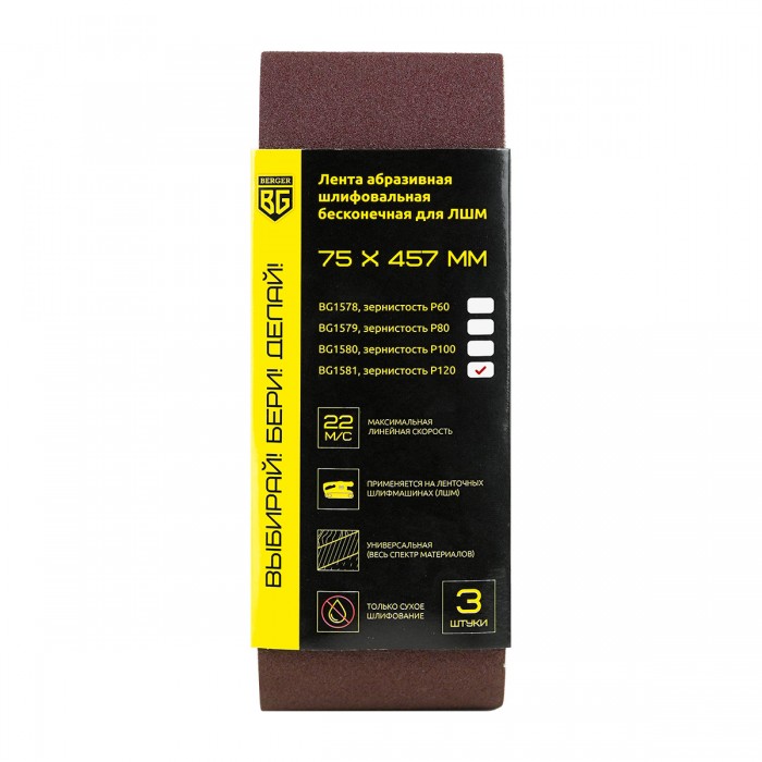 Лента абразивная шлифовальная бесконечная для ЛШМ (3 шт, 75х457 мм, P120) BERGER BG1581