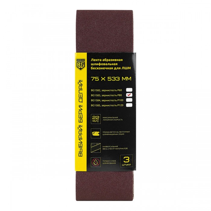 Лента абразивная шлифовальная бесконечная для ЛШМ (3 шт, 75х533 мм, P80) BERGER BG1583