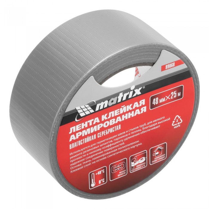 Лента армированная, влагостойкая, 48 мм х 25 м, серебристая Matrix (89068)