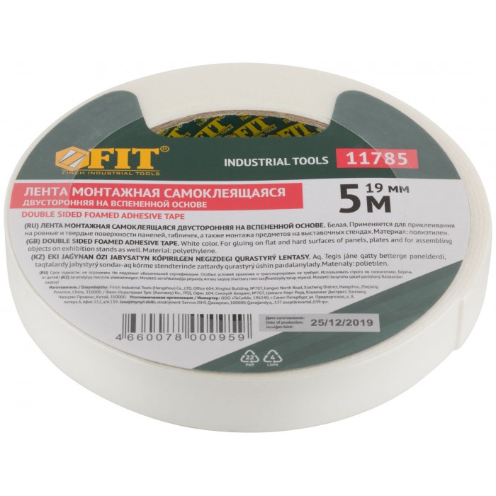 Лента клеящая, 2-х сторонняя монтажная,на вспененной основе, белая, 19 мм х 5 м (11785)