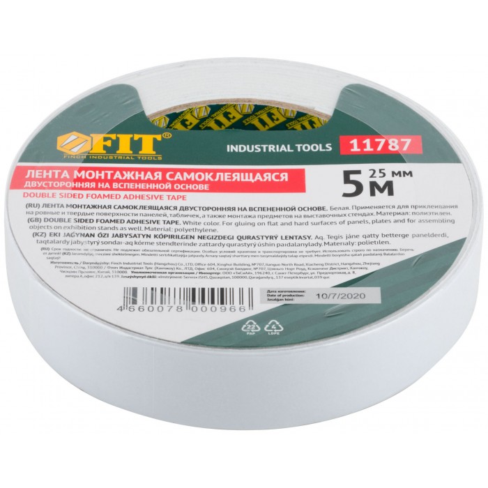 Лента клеящая, 2-х сторонняя монтажная,на вспененной основе, белая, 25 мм х 5 м (11787)
